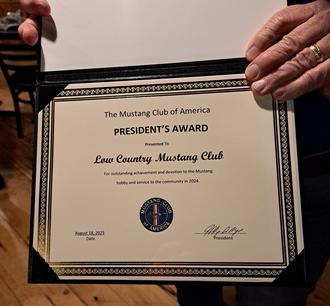 Duane will clear with Dave Hansen on having the trailer bright and early. Ken has the trophies “ready to go”….except for the plates that should be in Oct 2nd. The Food Truck and Porta-lets will be confirmed (again). Members need to arrive about 7:00AM with a CLEAN CAR, so they can help get everything set up and ready to receive vehicles for registration by 8:00AM. Rich Bible showed the MCA President’s Award he received on behalf of the Club at the Fredricksburg, MD Show. Thank you Rich for getting all the information completed to get us back on this prestigious list.