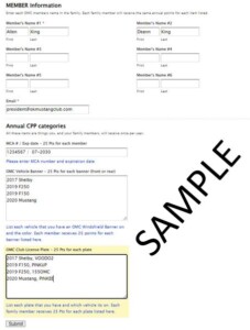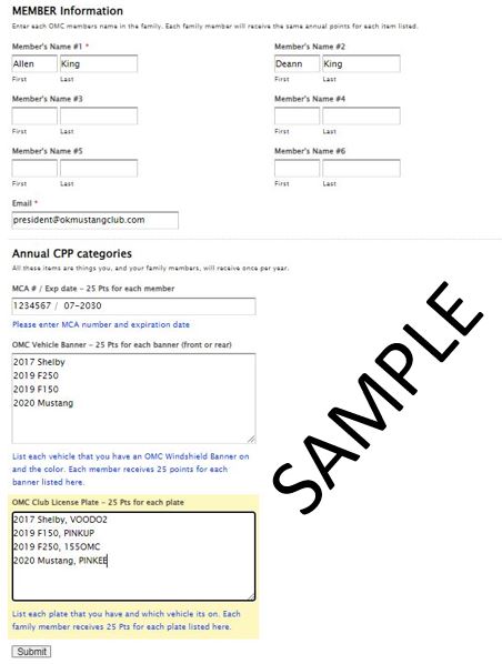 Members of the Oklahoma Mustang Club are eligible to earn CLUB PARTICIPATION POINTS (CPP) anytime they attend an OMC event as well as when they promote the club, our sponsor or is a Mustang Club of America (MCA). The items listed below are Annual CPP items and all members of your family earn points these points. Here is an example of how the form should be filled out.